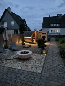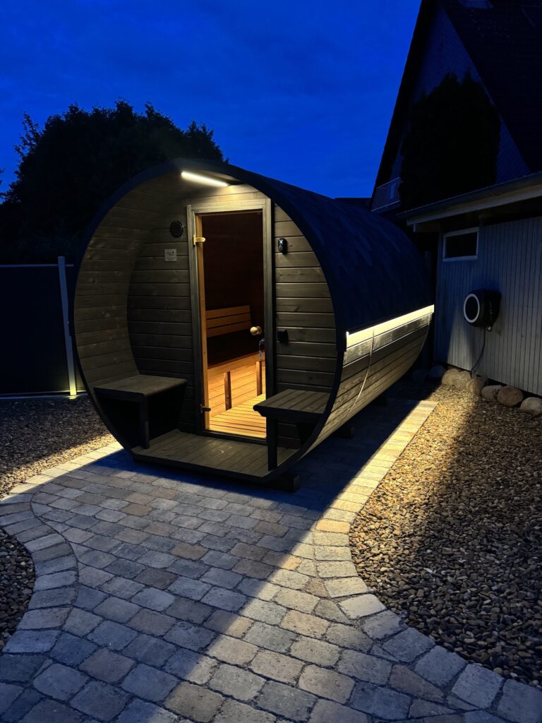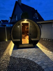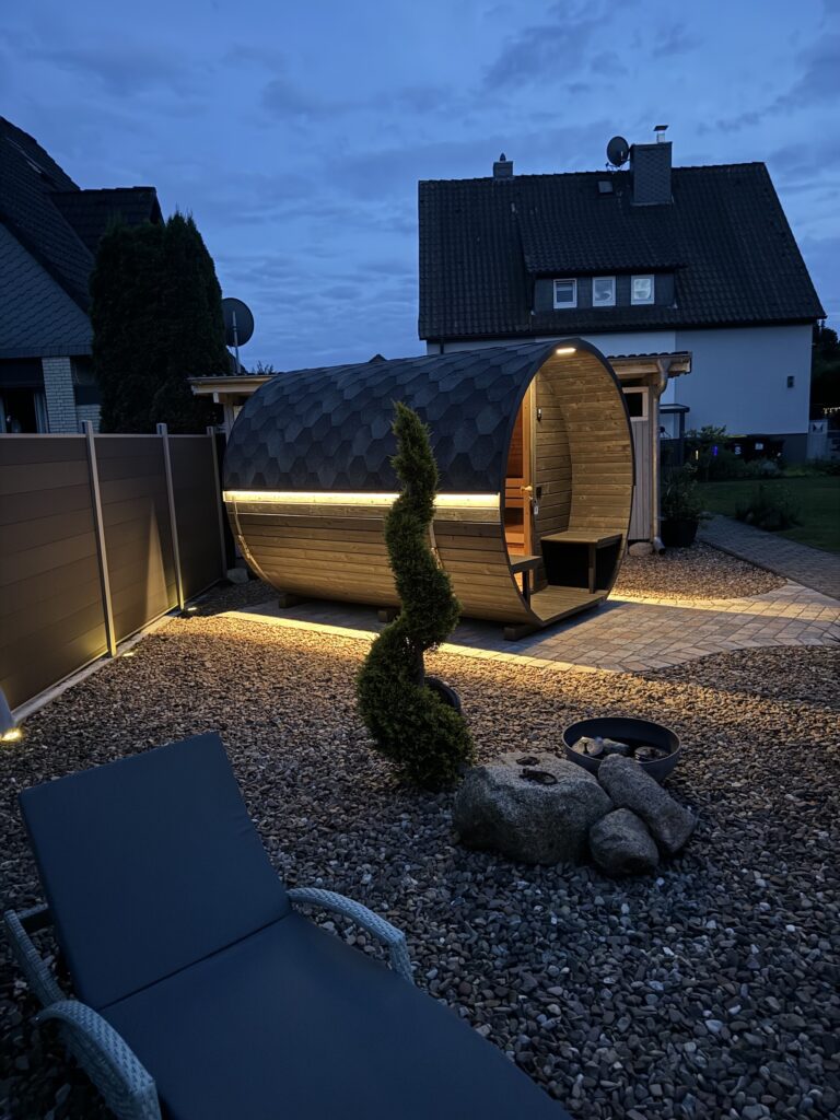Ein Mann baut eigene Sauna in einem Werkstatt auf.