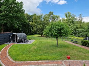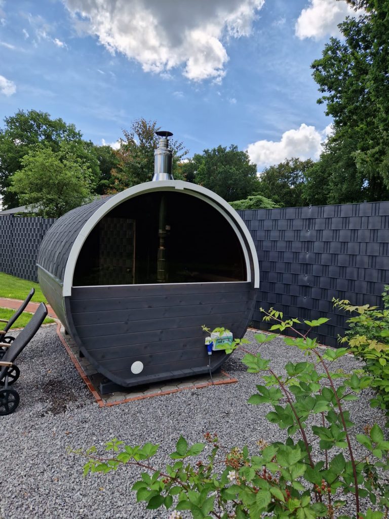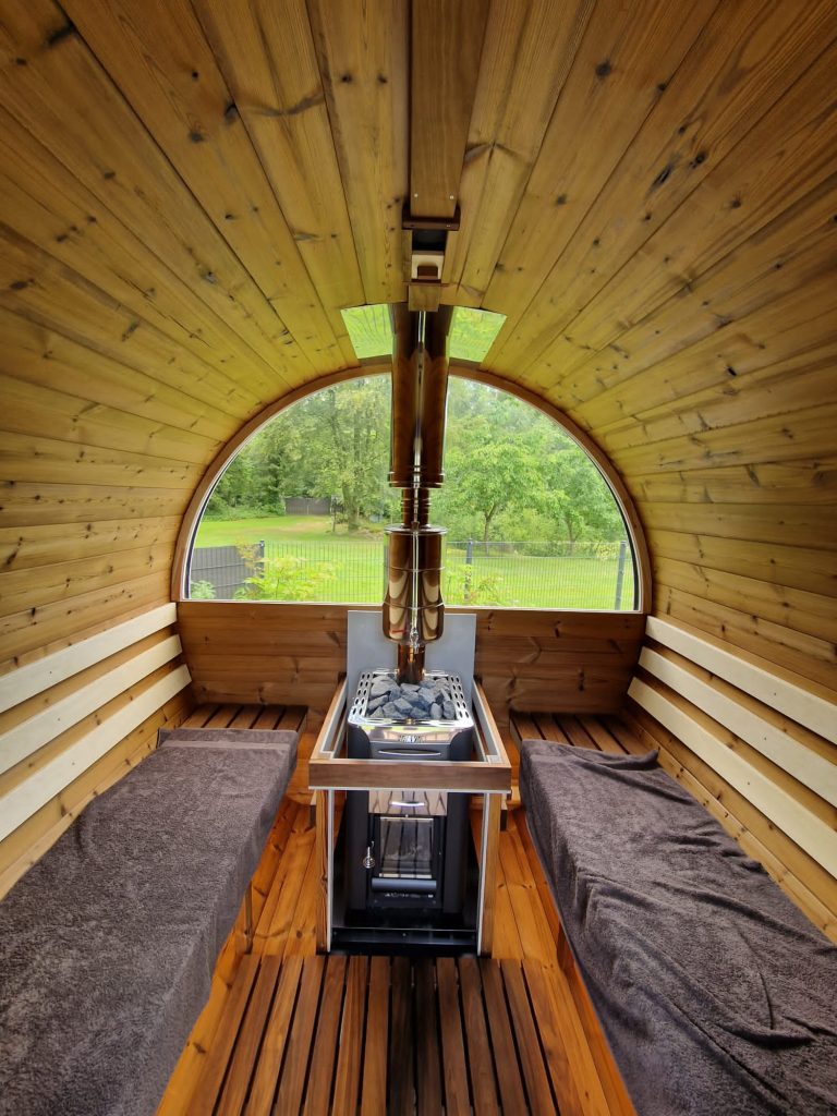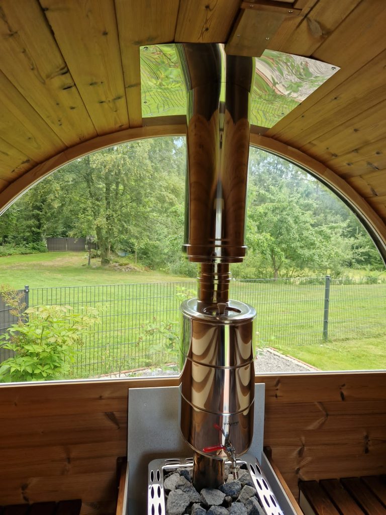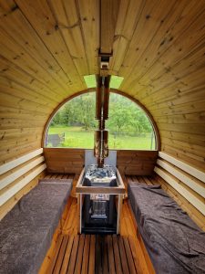 Ein Mann baut eigene Sauna in einem Werkstatt auf.