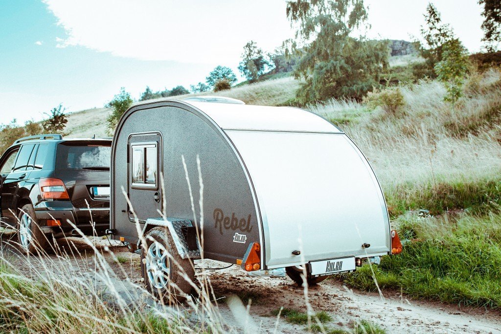 Einsamer Ausflug am Fluss mit Auto und Minicamper.